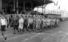 Sporta svētku parādē ierindā soļo skauti, tribīnēs valdības un sporta vadības locekļi, Rīgas pilsētas stadionā (tagad Daugavas stadions). Fonā plīvo Latvijas valsts karogi.