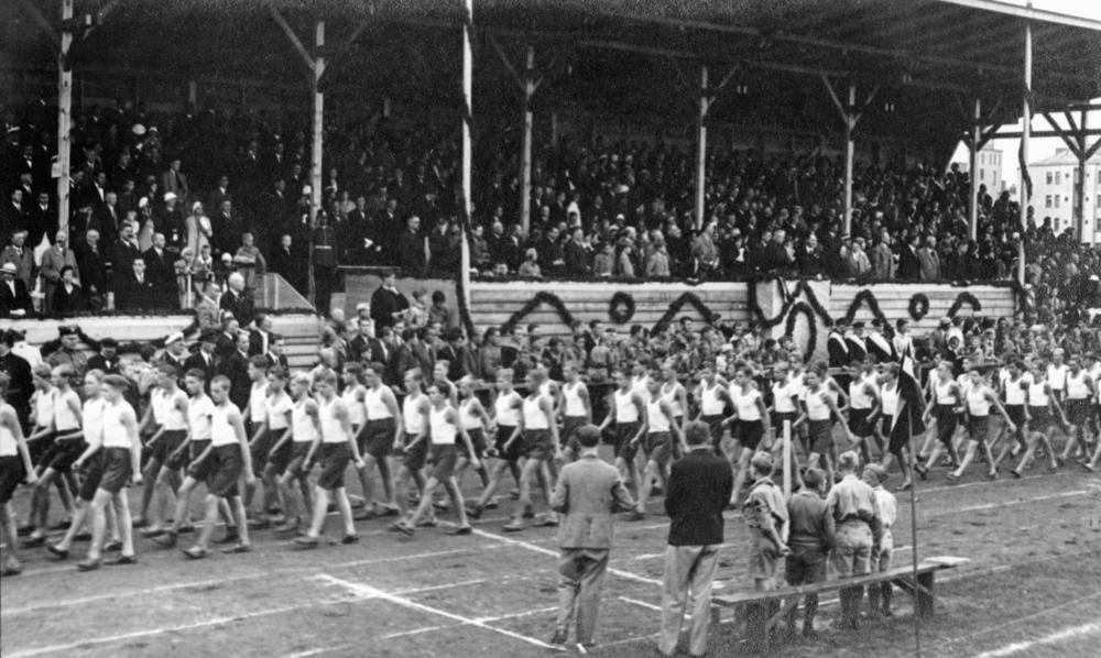 Sporta svētku parādē ierindā soļo skolu vingrotāji Rīgas pilsētas stadionā (tagad Daugavas stadions). Tribīnēs valdības un sporta organizāciju vadības locekļi.