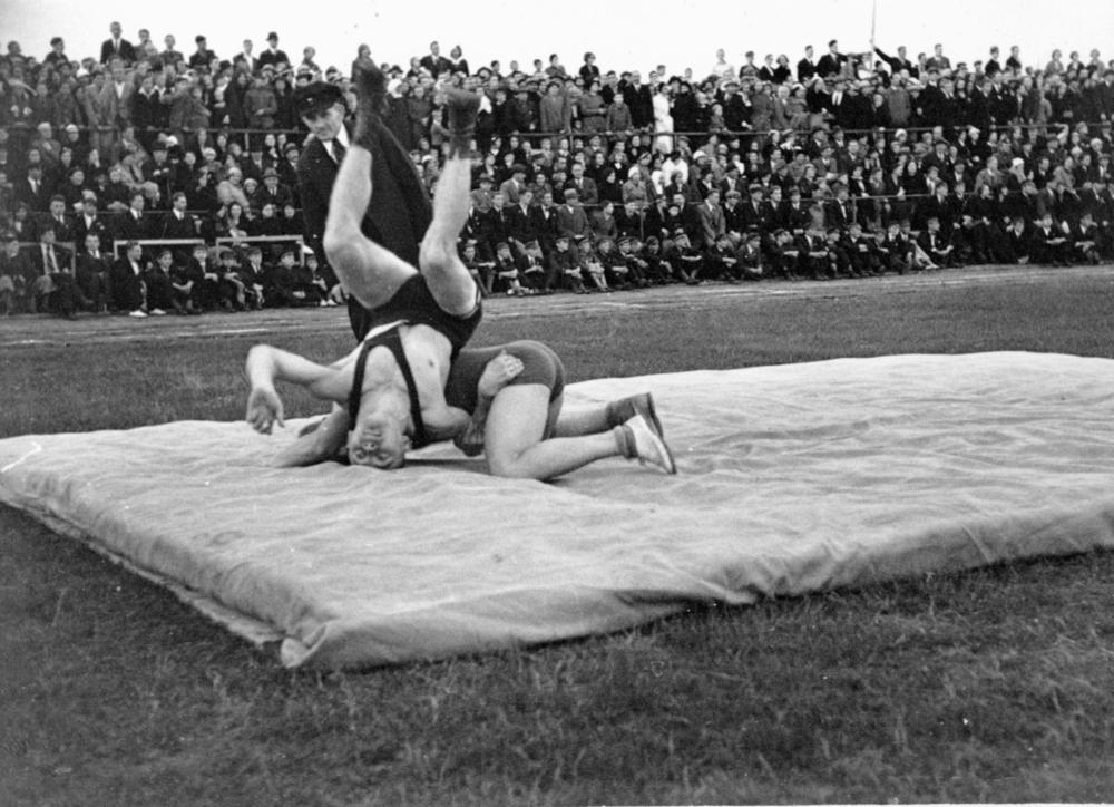 Grieķu-romiešu cīņa norise sporta svētku laikā Rīgas pilsētas stadionā (tagad Daugavas stadions).