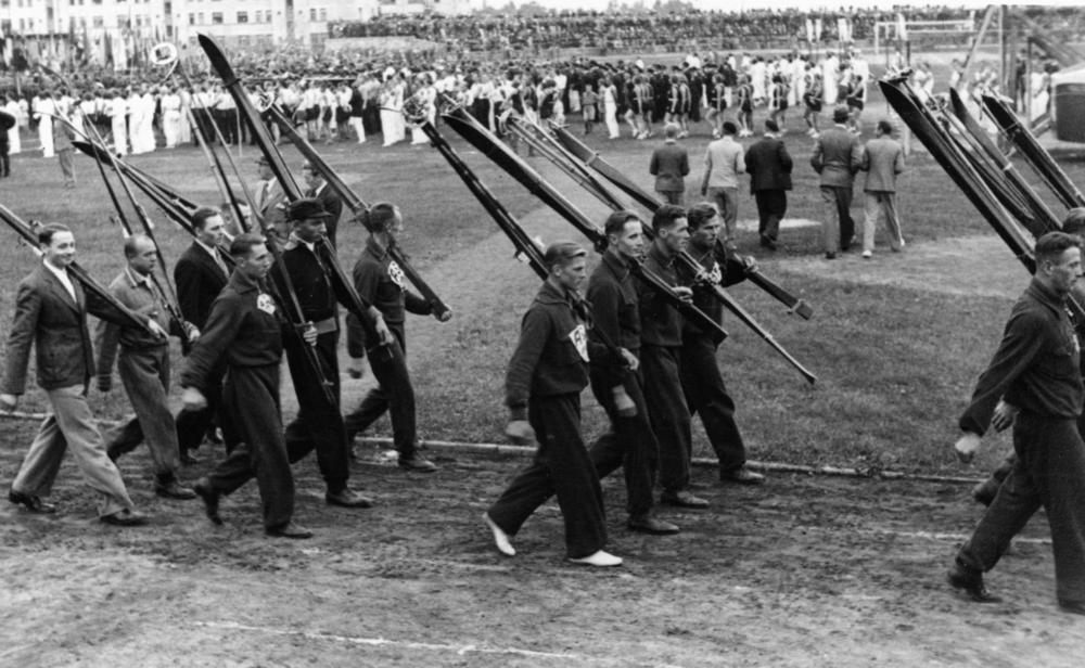 Sporta svētkos Rīgas pilsētas stadionā (tagad Daugavas stadions) parādē soļo slēpotāju komanda.