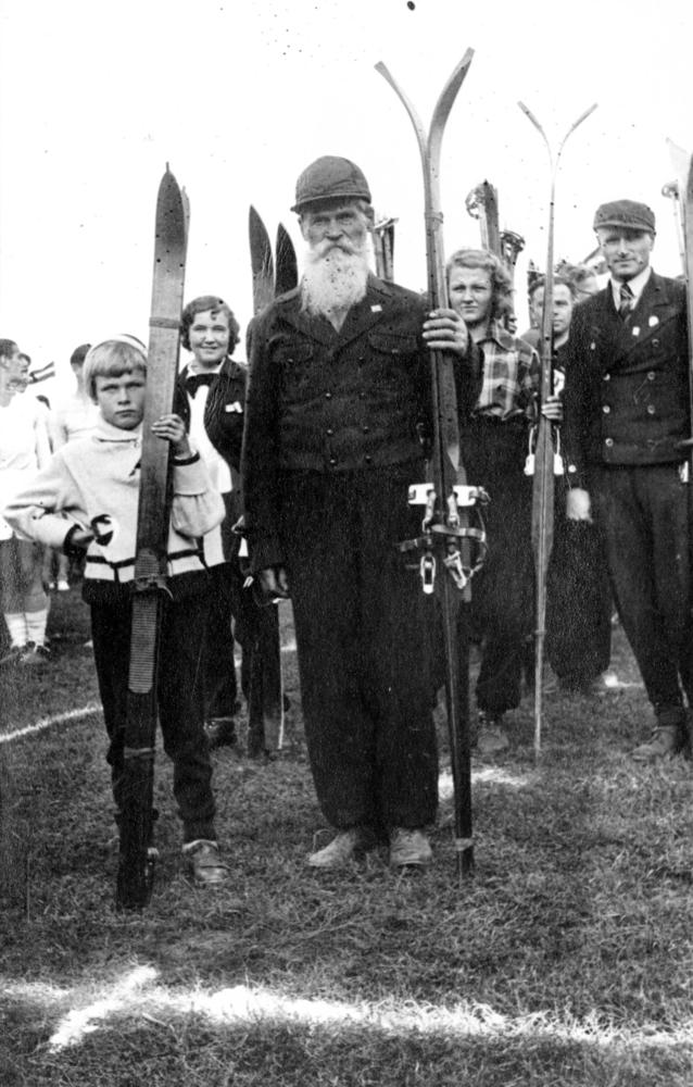 Pirms sporta svētku parādes stāv slēpotāju komanda, kurā redzamas vairākas paaudzes. Grupas foto.