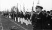 Sporta svētku parādes laikā ierindā stāv sporta organizāciju dalībnieki ar organizāciju karogiem Rīgas pilsētas stadionā (tagad Daugavas stadions). Priekšplānā no labās Latvijas kara flotes komandieris Teodors Spāde.