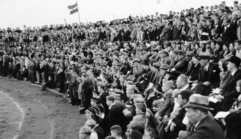 Pilnas skatītāju tribīnes sporta svētku laikā Rīgas pilsētas stadionā (tagad Daugavas stadions). Fonā plīvo Latvijas valsts karogs.