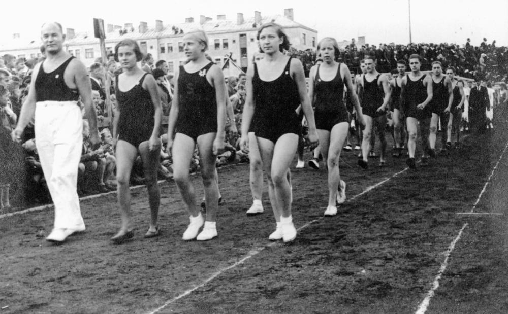Sporta svētkos Rīgas pilsētas stadionā (tagad Daugavas stadions) parādē soļo peldētāji. No kreisās: 1. Sporta biedrības "Strādnieks sports un sargs" treneris Jānis Butkēvičs, no 1934. gada Armijas Sporta kluba (ASK) un Latvijas izlases treneris.
