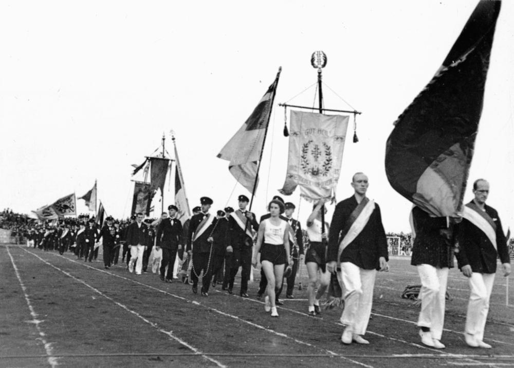 Sporta biedrību karogu parāde Rīgas pilsētas stadionā (tagad Daugavas stadions) sporta svētku laikā.
