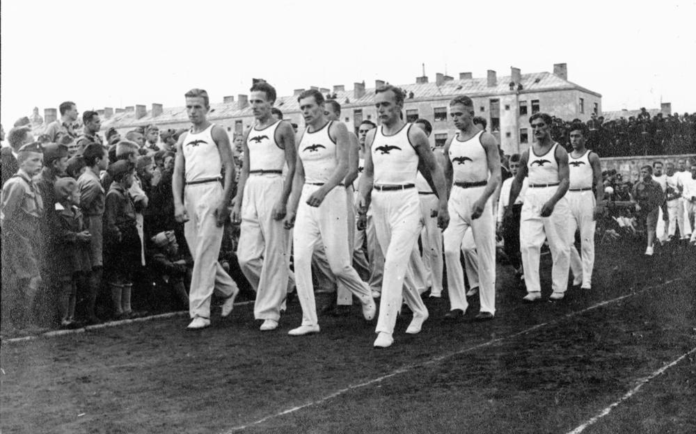 Sportistu parādē soļo ''Latvijas Vanagu'' organizācijas sportisti Rīgas pilsētas stadionā (tagad Daugavas stadions).