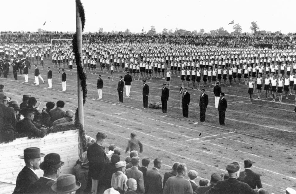 Skats no skatītāju tribīnēm uz sportistu rindām Rīgas pilsētas stadionā (tagad Daugavas stadions) sporta svētku laikā.