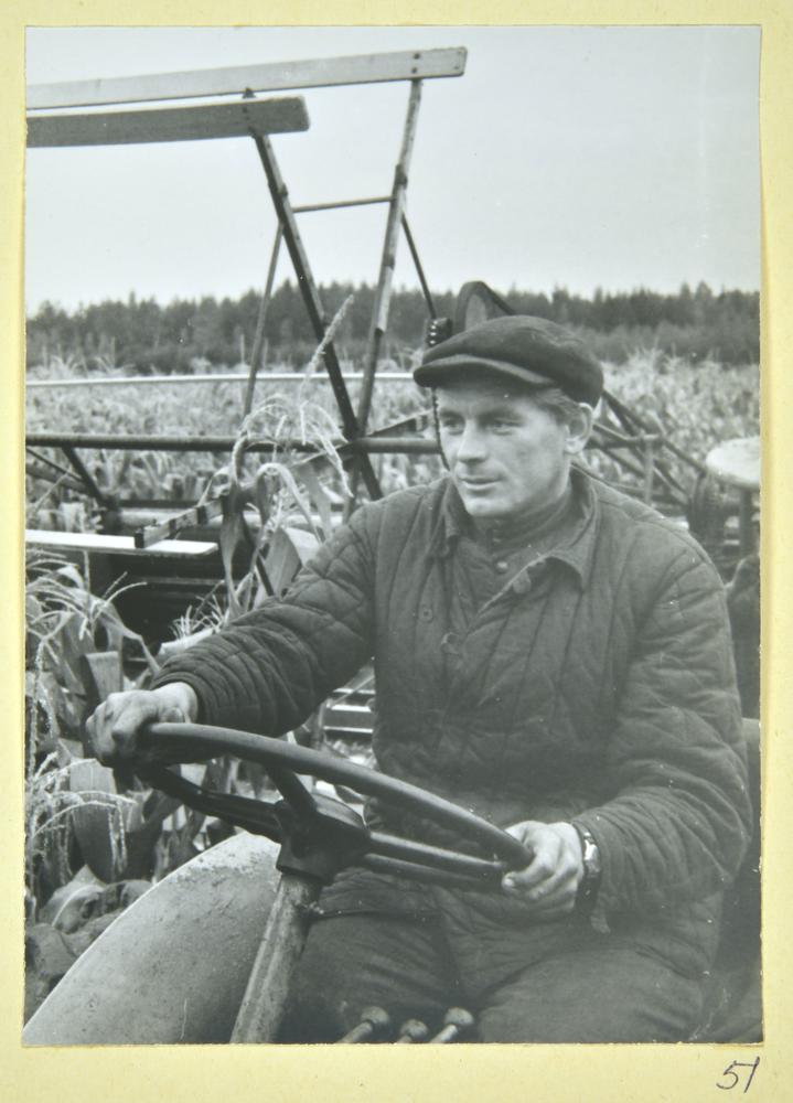 Valmieras rajona kolhoza "Seda" traktorists Gunārs Veseris piedalās kukurūzas novākšanā.