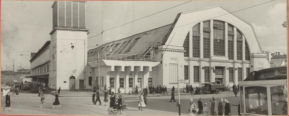 Rīgas Centrālajā kolhozu tirgū (Rīgas Centrāltirgus) skats uz ieeju Gaļas paviljonā un piebraucamo platformu pie piena un gaļas kontroles stacijas.