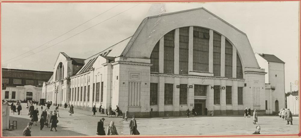 Skats uz Rīgas Centrālā kolhozu tirgus (Rīgas Centrāltirgus) Gaļas paviljonu no Rīgas Dzelzceļa stacijas puses.
