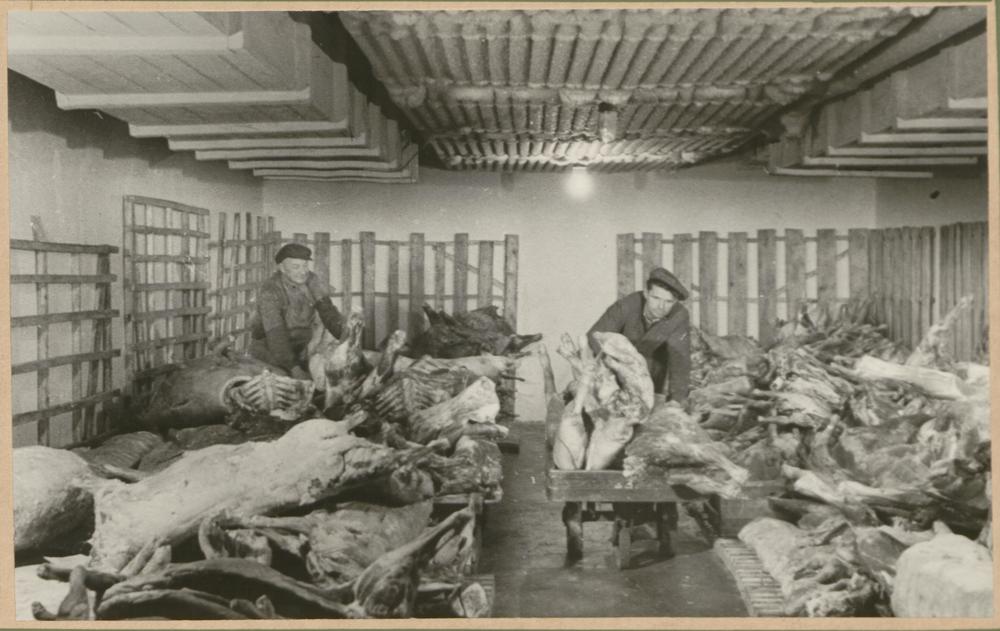 Rīgas Centrālā kolhozu tirgus (Rīgas Centrāltirgus) gaļas saldētavas kameras iekšskats.