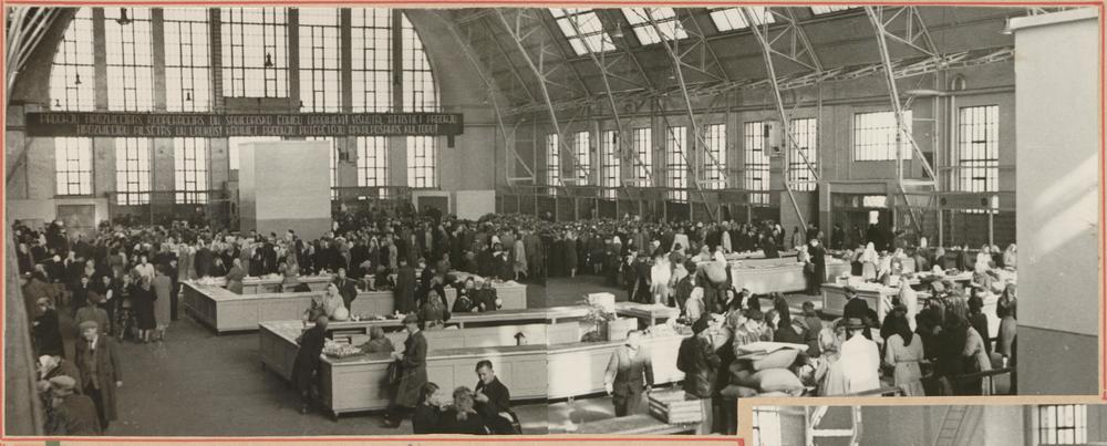 Rīgas Centrālā kolhozu tirgus (Rīgas Centrāltirgus) kopējā paviljona iekšskats.