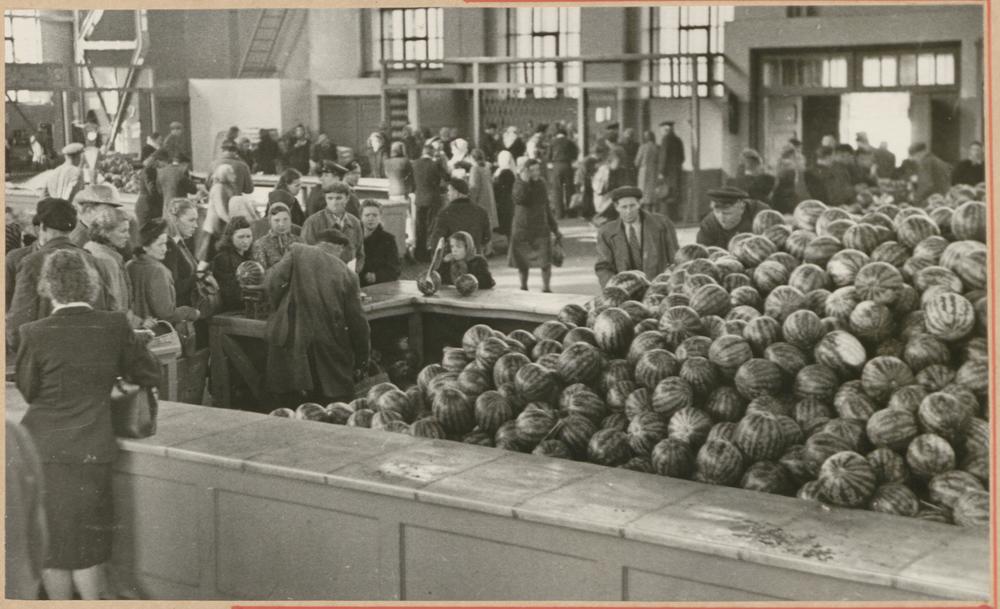 Arbūzu pārdošana Rīgas Centrālā kolhozu tirgus (Rīgas Centrāltirgus) kopējā paviljonā.