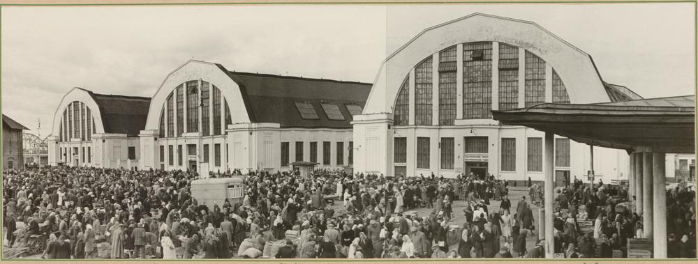 Tirgus laukums pie Rīgas Centrālā kolhozu tirgus (Rīgas Centrāltirgus) paviljoniem.