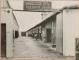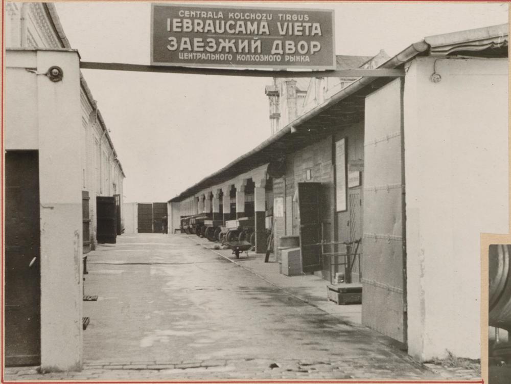 Rīgas Centrālā kolhozu tirgus (Rīgas Centrāltirgus) Iebraucamās vietas skats, pa kreisi zirgu staļļi, pa labi nojume ratiem.