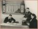 Rīgas Centrālā kolhozu tirgus (Rīgas Centrāltirgus) sienas avīzes redkolēģija darbā. Pie sienas stends ar uzrakstu krievu valodā "Tirgus darbinieks".
