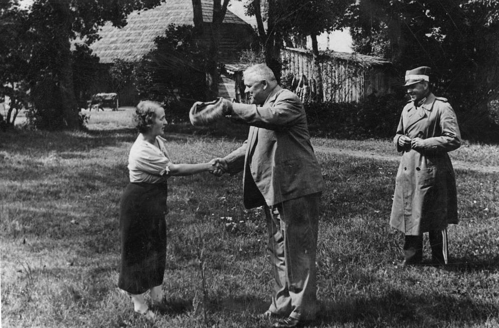 Latvijas Valsts un Ministru prezidents Kārlis Ulmanis (centrā) viesojas Ādažu pagasta lauku mājās. No labās: 1. prezidenta adjutants Miervaldis Lūkins.