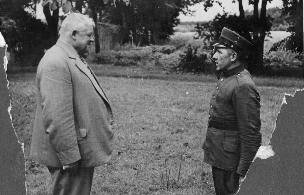 Latvijas Valsts un Ministru prezidents Kārlis Ulmanis (no kreisās 1.) Ādažu pagastā sarunājas ar jaunāko kārtībnieku.