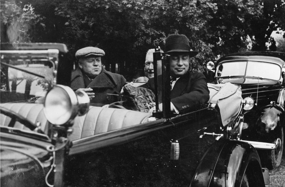 Latvijas Valsts un Ministru prezidents Kārlis Ulmanis (no kreisās 1.) sēž automašīnā Ādažu pagasta apmeklējuma laikā.