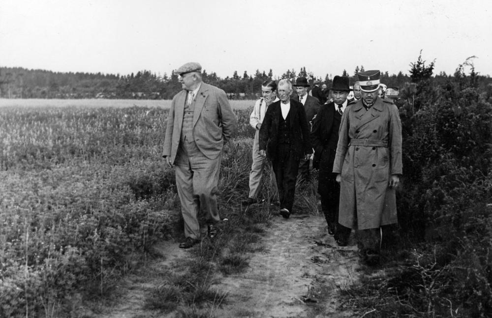 Latvijas Ministru prezidents Kārlis Ulmanis viesošanās laikā Rīgas apriņķa Ādažu pagastā aplūko laukus. No kreisās: 1. Kārlis Ulmanis, no labās: 1. Ministru prezidenta adjutants Miervaldis Lūkins. (Pēc Latvijas Valsts un Ministru prezidenta Kārļa Ulmaņa ierosinājuma Latvijas Lauksaimniecības Kamera izveidoja lupīnu izmēģinājumu laukus Ādažu pagasta mājās "Makstenieki"?).