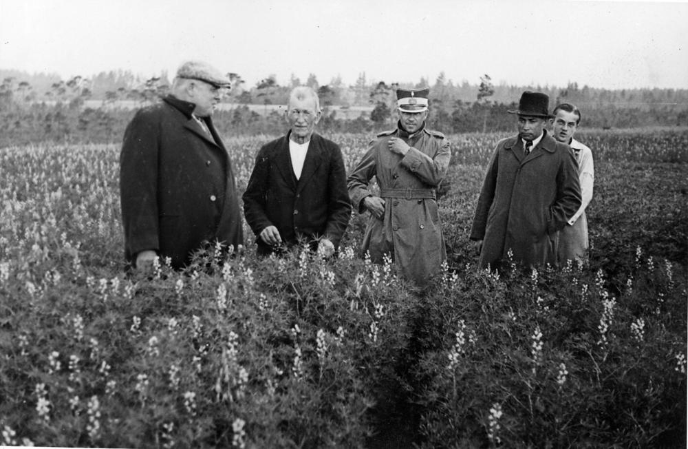 Latvijas Valsts un Ministru prezidents Kārlis Ulmanis (no kreisās 1.) viesojas Ādažu pagastā. No kreisās: 3. prezidenta adjutants Miervaldis Lūkins. (Pēc Latvijas Valsts un Ministru prezidenta Kārļa Ulmaņa ierosinājuma Latvijas Lauksaimniecības Kamera izveidoja lupīnu izmēģinājumu laukus Ādažu pagasta mājās "Makstenieki"? Izmēģinājuma laukos audzēja arī augu seradella).