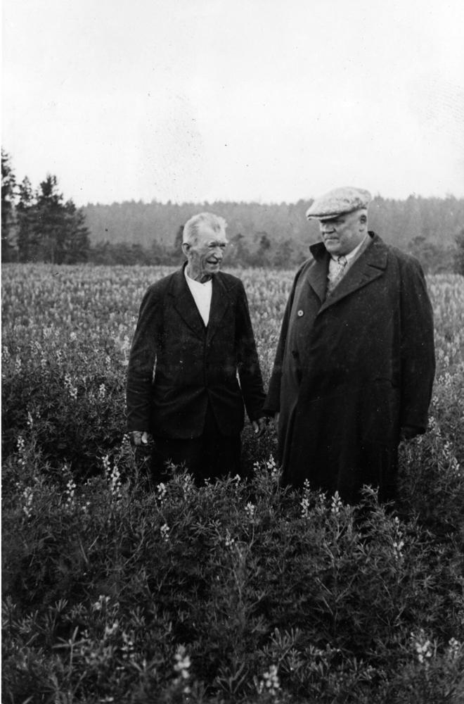 Latvijas Valsts un Ministru prezidents Kārlis Ulmanis (no labās 1.) viesojas Ādažu pagastā. (Pēc Kārļa Ulmaņa ierosinājuma Latvijas Lauksaimniecības Kamera izveidoja lupīnu izmēģinājumu laukus Ādažu pagasta mājās "Makstenieki"? Izmēģinājuma laukos audzēja arī augu seradella).