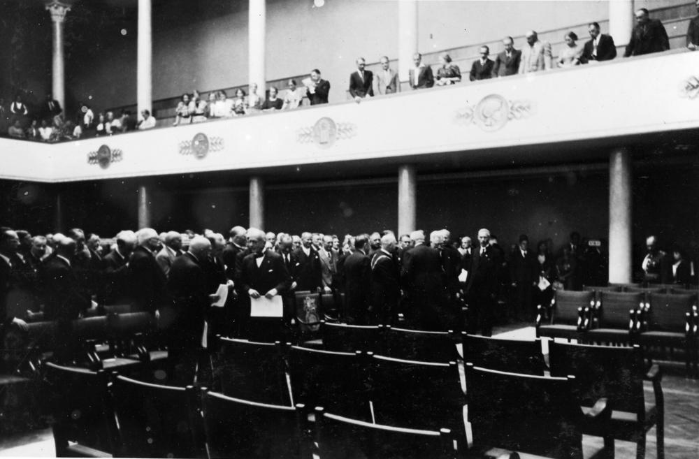 Pirmās Baltijas vēsturnieku konferences Rīgā dalībnieki Latvijas Universitātes Lielajā aulā sagaida Latvijas Valsts un Ministru prezidentu Kārli Ulmani. 1. rindā grupā Latvijas Vēstures institūta vicedirektors Francis Balodis, Latvijas Universitātes rektors profesors Mārtiņš Prīmanis, Kārlis Ulmanis, izglītības ministrs profesors Augusts Tentelis.