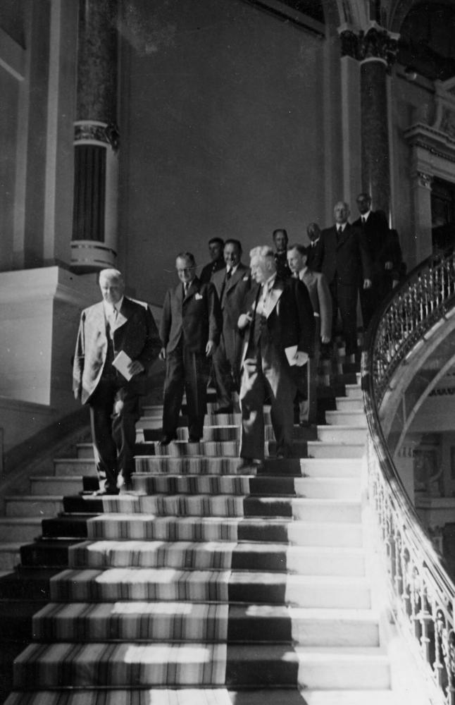 Izstāde "Senā Rīga" Rīgas pilsētas mākslas muzejā Baltijas vēsturnieku konferences dienā. Uz muzeja kāpnēm priekšplānā no kreisās: 1. Latvijas Valsts un Ministru prezidents Kārlis Ulmanis, 2. Rīgas pilsētas galva Roberts Liepiņš, 4. izglītības ministrs profesors Augusts Tentelis, 5. Latvijas vēstures institūta vicedirektors Francis Balodis.
