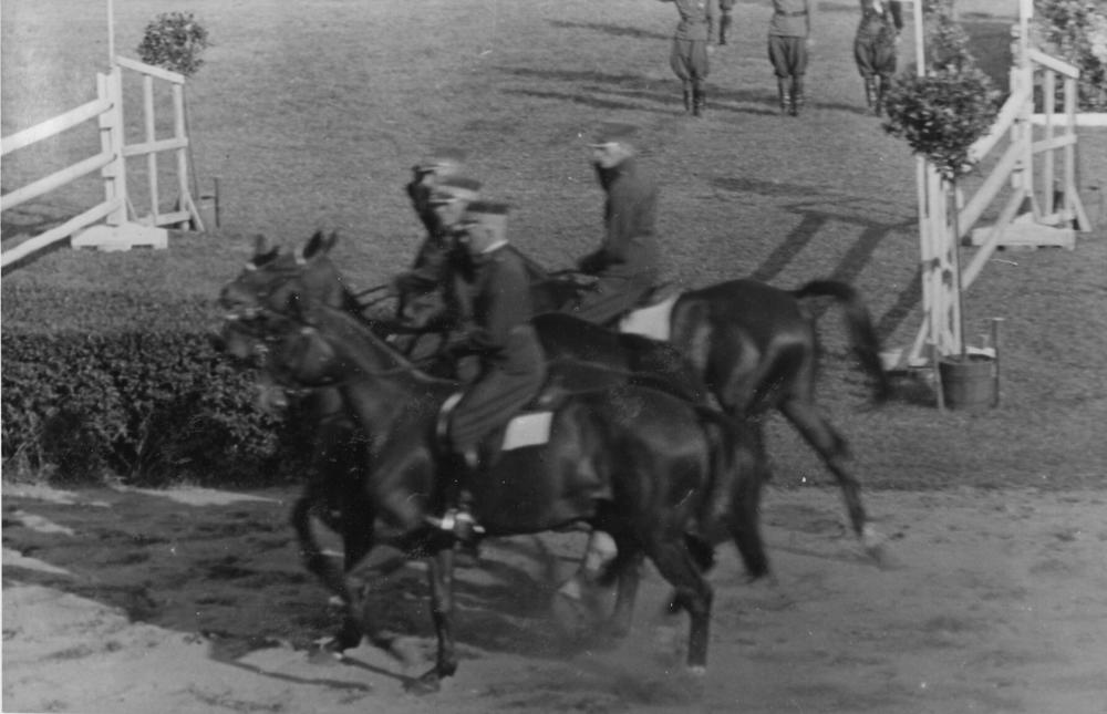 10. Starptautiskās jāšanas sacīkstes Rīgas hipodromā. Latvijas komandas jātnieki parādes laikā.