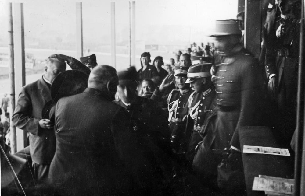 10. Starptautiskās jāšanas sacīkstes Rīgas hipodromā. Latvijas Valsts un Ministru prezidents Kārlis Ulmanis (no kreisās 2.) apsveic Francijas komandas virsniekus ar uzvaru Vadoņa kausa izcīņā. No kreisās: 1. kara ministrs ģenerālis Jānis Balodis.