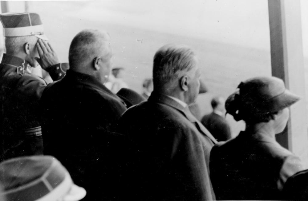 10. Starptautiskās jāšanas sacīkstes Rīgas hipodromā. Tribīnē no kreisās: 2. Latvijas Valsts un Ministru prezidents Kārlis Ulmanis, 2. kara ministrs ģenerālis Jānis Balodis.