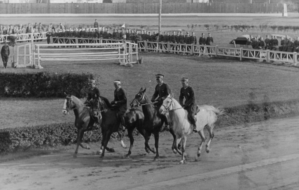 10. Starptautiskās jāšanas sacīkstes Rīgas hipodromā. Parāde. Jātnieki jāj gar valdības tribīni.