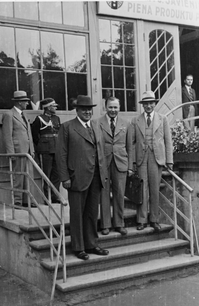 Latvijas Valsts un Ministru prezidents Kārlis Ulmanis pastaigas laikā Arkādijas parkā uz kāpnēm pie Latvijas Piensaimniecības centrālās savienības piena produktu paviljona. No kreisās: 1. Kārlis Ulmanis, 3. sabiedrisko lietu ministrs Alfrēds Bērziņš. 2. rindā no kreisās: 2. prezidenta adjutants Miervaldis Lūkins.