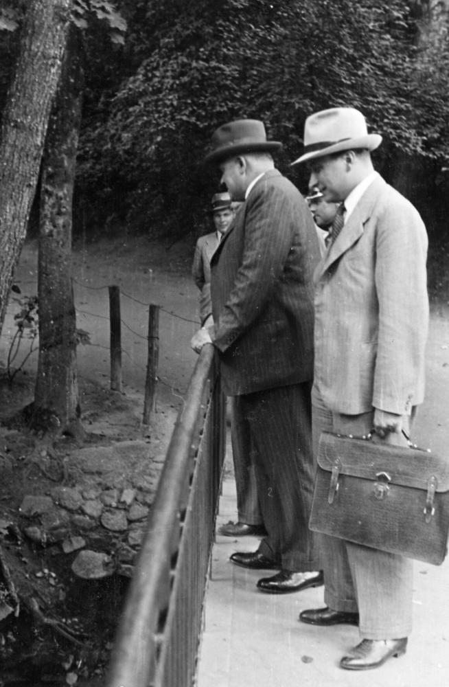 Latvijas Valsts un Ministru prezidents Kārlis Ulmanis (centrā) pastaigas laikā Arkādijas parkā. No labās: 1. sabiedrisko lietu ministrs Alfrēds Bērziņš.