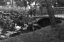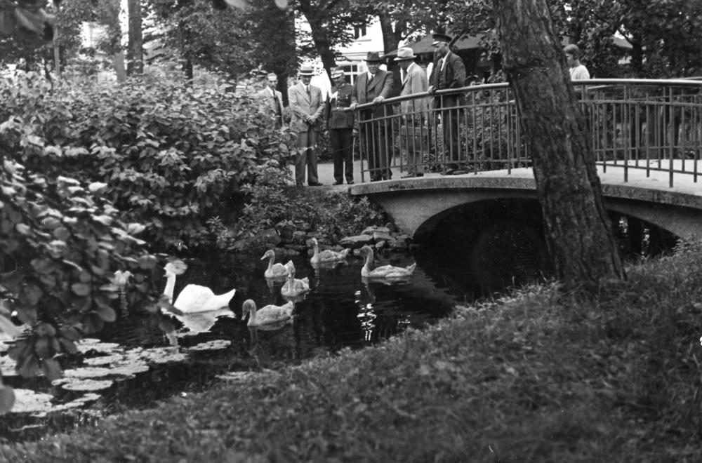 Latvijas Valsts un Ministru prezidents Kārlis Ulmanis pastaigas laikā Arkādijas parkā stāv uz tiltiņa un vēro gulbjus. No kreisās: 3. prezidenta adjutants Miervaldis Lūkins, 4. Kārlis Ulmanis, 5. sabiedrisko lietu ministrs Alfrēds Bērziņš.