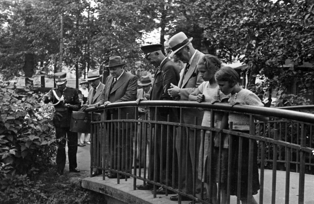 Latvijas Valsts un Ministru prezidents Kārlis Ulmanis pastaigas laikā Arkādijas parkā uz tiltiņa. No kreisās: 1. prezidenta adjutants Miervaldis Lūkins, 2. sabiedrisko lietu ministrs Alfrēds Bērziņš, 3. Kārlis Ulmanis.
