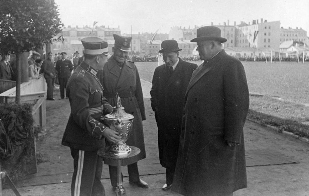 Latvijas futbola kausa izcīņas finālspēle Armijas sporta (ASK) laukumā. Pie Latvijas jeb Kārļa Ulmaņa dāvinātā mūžīgi ceļojošā kausa stāv no kreisās: 1. Latvijas Futbola savienības priekšsēdētājs pulkvežleitnants Juris Rēdlihs-Raiskums, 2. Latvijas Fiziskās kultūras un sporta komitejas priekšsēdētāja biedrs Rūdolfs Klinsons, 3. Latvijas Republikas sabiedrisko lietu ministrs Alfrēds Bērziņš, 4. Latvijas Valsts un Ministru prezidents Kārlis Ulmanis.