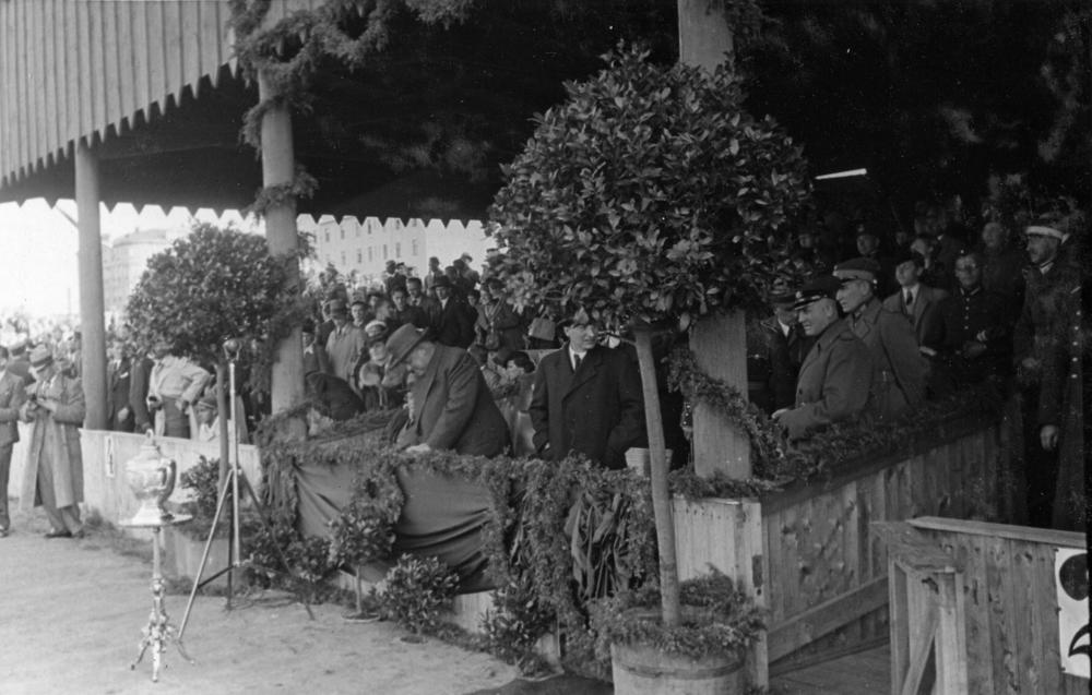 Latvijas futbola kausa izcīņas finālspēle Armijas sporta (ASK) laukumā. Valdības ložā no kreisās: 1. Latvijas Valsts un Ministru prezidents Kārlis Ulmanis, 2. Latvijas Republikas sabiedrisko lietu ministrs Alfrēds Bērziņš, 3. Latvijas Fiziskās kultūras un sporta komitejas priekšsēdētāja biedrs Rūdolfs Klinsons, 4. Latvijas Futbola savienības priekšsēdētājs pulkvežleitnants Juris Rēdlihs-Raiskums.