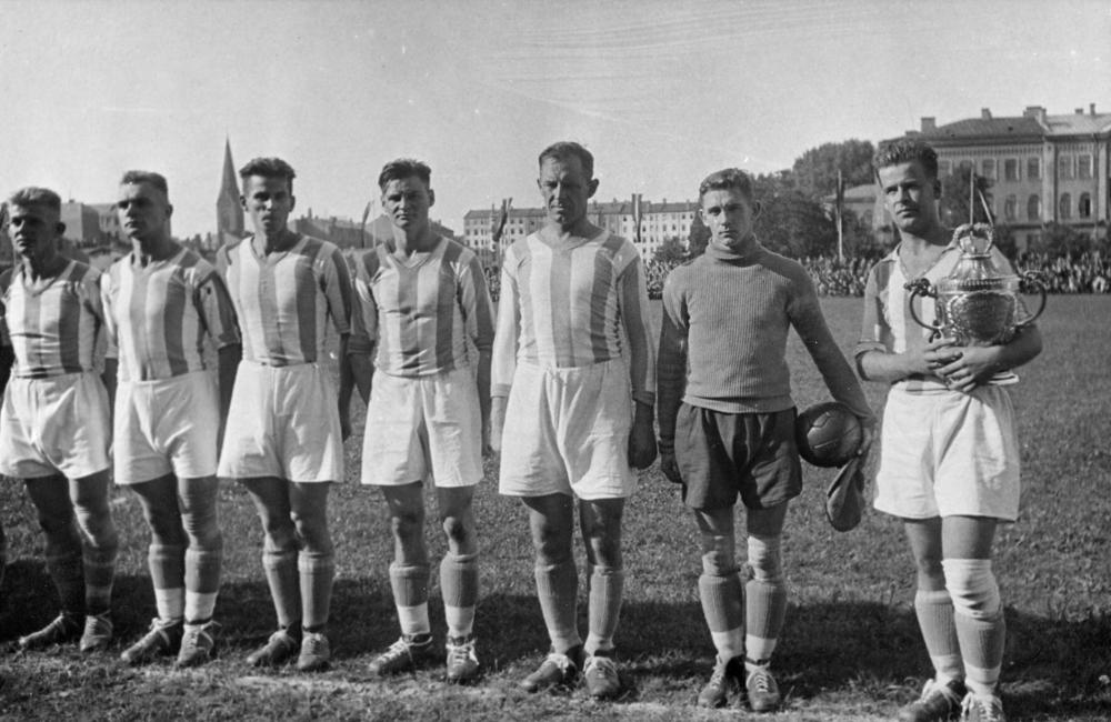 Latvijas kausa futbola izcīņas finālspēle. Kausa ieguvēji Rīgas futbola kluba (RFK) komanda. No labās: 1. komandas kapteinis Jānis Lidmanis ar izcīnīto futbola kausu.