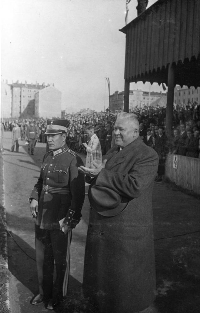 Latvijas kausa izcīņas finālspēle futbolā Armijas sporta kluba (ASK) laukumā. No kreisās: 1. Latvijas Futbola savienības priekšsēdētājs pulkvežleitnants Juris Rēdlihs-Raiskums, 2. Latvijas Valsts un Ministru prezidents Kārlis Ulmanis.