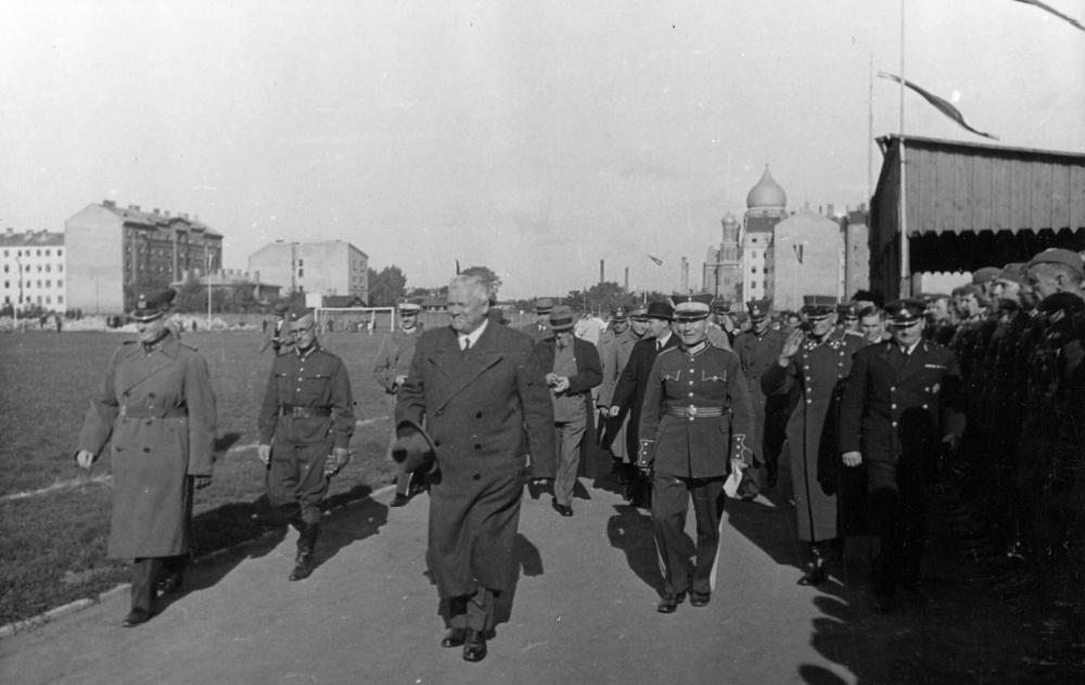 Latvijas futbola kausa izcīņas finālspēle Armijas sporta (ASK) laukumā. No kreisās: 1. Latvijas Fiziskās kultūras un sporta komitejas priekšsēdētāja biedrs Rūdolfs Klinsons, 2. Latvijas Fiziskās kultūras un sporta komitejas priekšsēdētāja biedrs Rūdolfs Klinsons, 3. Latvijas Futbola savienības priekšsēdētājs pulkvežleitnants Juris Rēdlihs-Raiskums