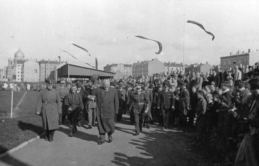 Latvijas futbola kausa izcīņas finālspēle Armijas sporta laukumā. Priekšplānā no kreisās: 1. Latvijas fiziskās kultūras un sporta komitejas vicepriekšsēdētājs ģenerālis Rūdolfs Klinsons, 2. prezidenta sekretārs Jānis Cimermanis (Jānis Rudums), 3. Latvijas Valsts un Ministru prezidents Kārlis Ulmanis, 4. Latvijas futbola savienības priekšsēdētājs pulkvežleitnants Juris Redlihs (Juris Raiskums).