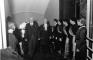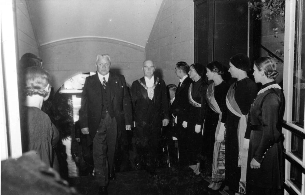 Latvijas Universitātes (LU) 18 gadu pastāvēšanas svētki. Latvijas Valsts un Ministru prezidents Kārlis Ulmanis ierodas Latvijas Universitātē, viņu sagaida LU studenti. Centrā no kreisās: 1. Kārlis Ulmanis, 2. Latvijas Universitātes rektors Mārtiņš Prīmanis.