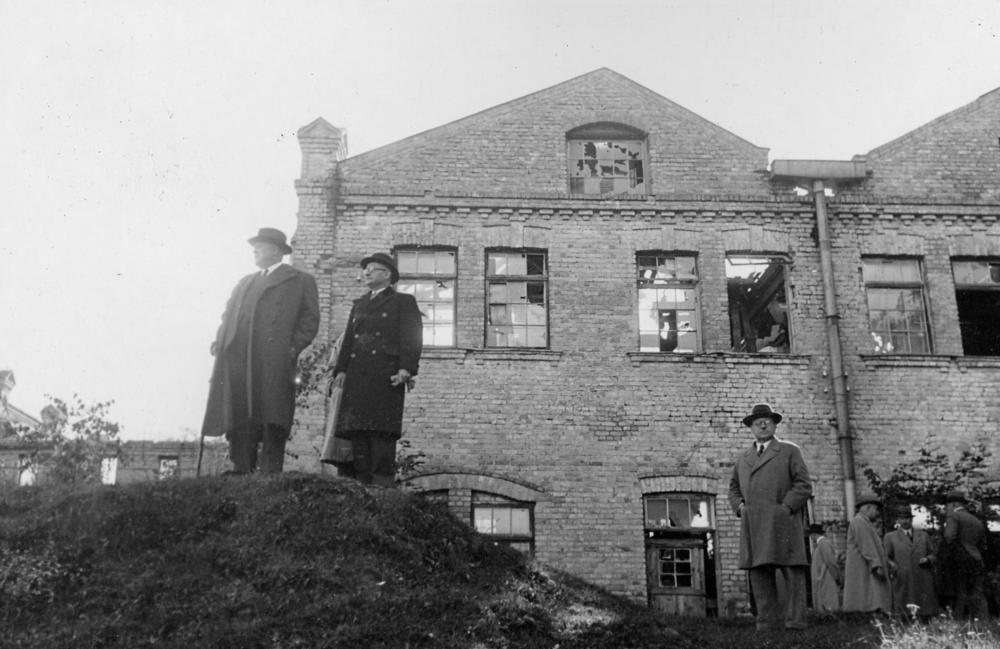 Latvijas Valsts un Ministru prezidents Kārlis Ulmanis (no kreisās 1.) iepazīstas ar projektējamās jaunbūves vietu. No kreisās: 2. Rīgas pilsētas galva Roberts Liepiņš, 3. Latvijas Universitātes Veterinārās medicīnas fakultātes dekāns Voldemārs Brencēns. (Valmieras ielā 2 ?)