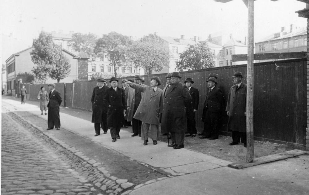 Latvijas Valsts un Ministru prezidents Kārlis Ulmanis (centrā) iepazīstas ar projektējamās jaunbūves vietu. Priekšplānā Latvijas Universitātes Veterinārās medicīnas fakultātes dekāns Voldemārs Brencēns. Grupā izglītības ministrs Augusts Tentelis, Rīgas pilsētas galva Roberts Liepiņš, Rīgas pilsētas būvju valdes priekšnieks, arhitekts Pāvils Dreijmanis (?), Latvijas Kredītbankas direktors Andrejs Bērziņš.