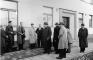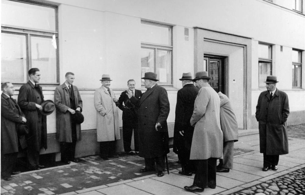Latvijas Valsts un Ministru prezidents Kārlis Ulmanis (centrā) uz ietves atvadās no Rīgas resoru pārstāvjiem pēc gruntsgabalu, kas paredzēti jaunu ēku uzbūvei, apskates.