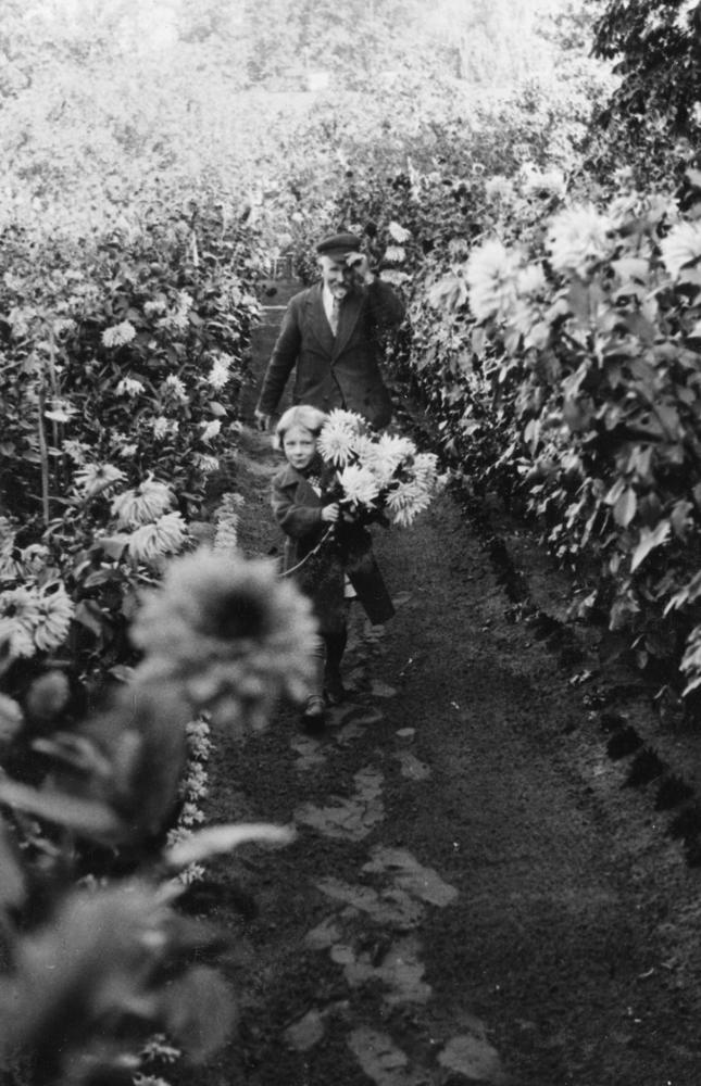 Dārznieks Jānis Pugulis savas dāliju audzētavas dārzā Kandavas ielā 3 un bērns ar dālijām rokās sagaida Latvijas Valsts un Ministru prezidentu Kārli Ulmani.