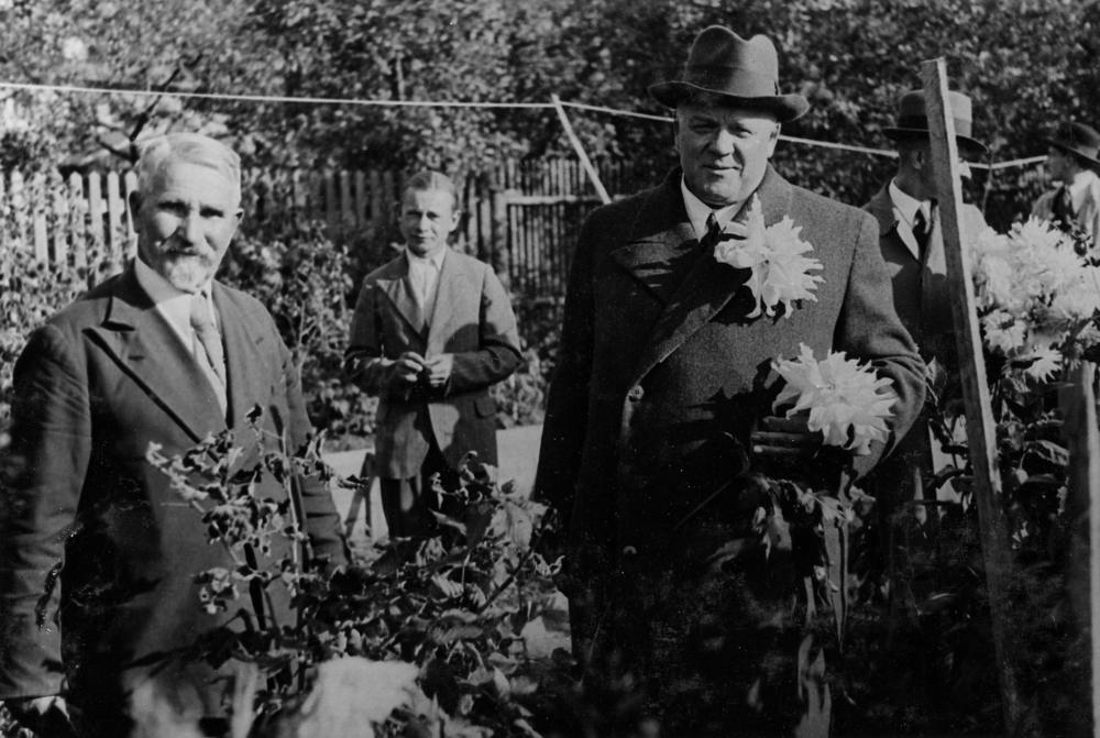 Latvijas Valsts un Ministru prezidents Kārlis Ulmanis Jāņa Puguļa dāliju audzētavā Kandavas ielā 3. No kreisās: 1. dārznieks Jānis Pugulis, 3. Kārlis Ulmanis.