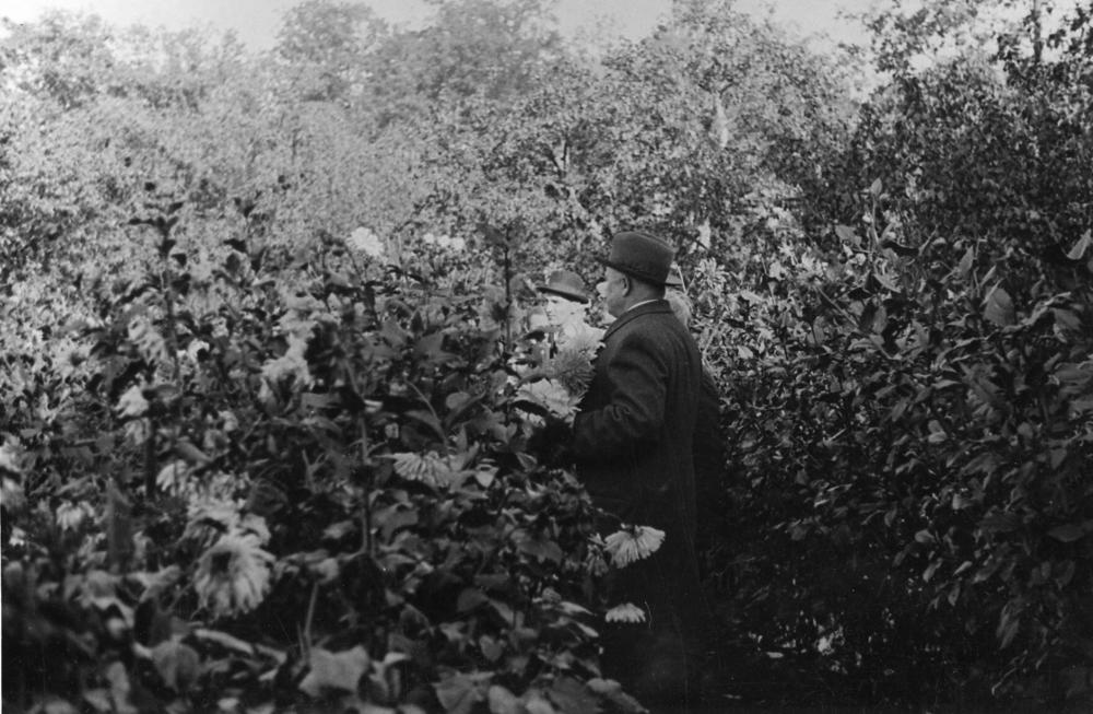 Latvijas Valsts un Ministru prezidents Kārlis Ulmanis Jāņa Puguļa dāliju audzētavas dārzā (priekšplānā).