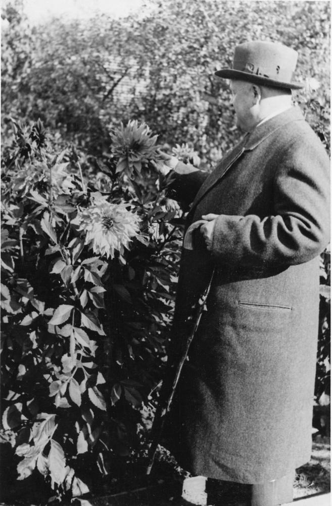 Latvijas Valsts un Ministru prezidents Kārlis Ulmanis Jāņa Puguļa dāliju audzētavas dārzā aplūko dālijas.